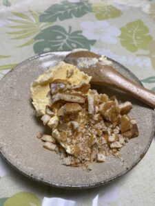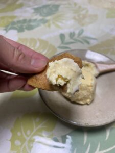 ディップして食べてもいいですし、おせんべいを砕いて上からかけてみたり、チョコチップアイスのように混ぜ込んで食べても美味しいです。甘党の方もしょっぱ党の方にも、愛していただけるコンビネーションだなぁと思います。
