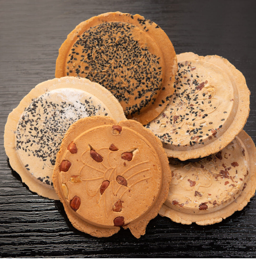 最近では、ごま、海苔、青のりはもちろんニンニク、チーズ、マヨネーズ、さらにチョコレートせんべいなどバリエーションが豊富です。