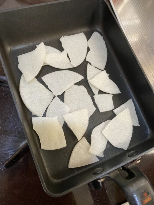 先日、割れ生地を小さめに割ってフライパンで炒ってみたところ、素焼きのあられ煎餅が出来上がりました!!